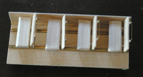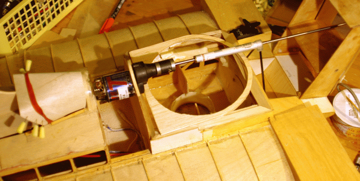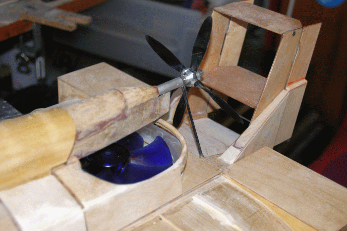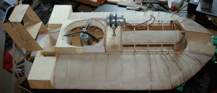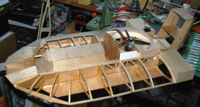 | Nachfolgend einige Fotos aus meiner Werft. Von den ursprünglich in den Plänen von Mark angedacheten Motorisierung ist nicht viel übrig geblieben. Beim Hub Motor habe ich zunächst einen 3-Blatt Prop und einen 450er Motor vorgesehen. Diese erschien mir aber zu schwer und sah nicht so toll aus. Ausserdem hatte ich nicht genug Platz (Höhe). | ![]() Balsa Spanten, teilweise beplankt und 3-Blatt Hubmotor |