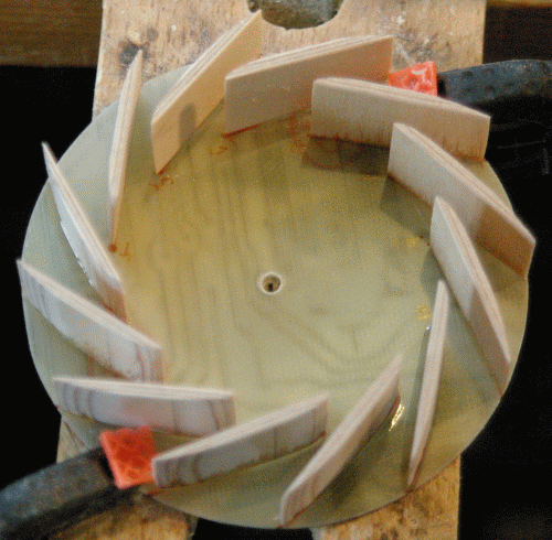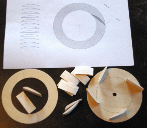 für den Lufteinlass. So entstand ein 2ter Impeller. Eine alte Leiterplatte diente als Basis. Schaufeln aus profiliertem Sperrbolzstücken. Für den Abschluss fertigte ich zunächst eine Abwicklung, die ich auf 0.5 mm Epoxymaterial übertrug und mit 2-K Kleber verklebte. | erster Prototyp zweiter Radialimpeller |